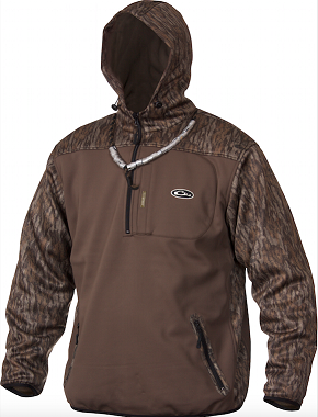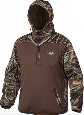 Soft-shell interlock material, Magnattach Call Pocket on left chest, Lower zipped pockets, Mesh-lined sleeves for easy on/off, Deep quarter-zip neck, Fleece-linded hood with draw string and and elastic waist hem.